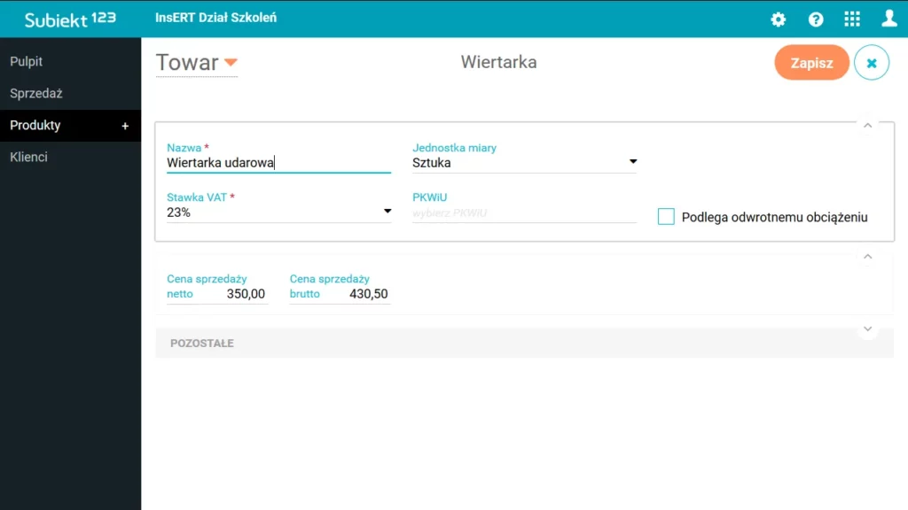 Subiekt 123 to przyjazny i łatwy w obsłudze system online do wystawiania faktur, zarządzania informacjami o klientach oraz prowadzenia kartotek usług i towarów. Jest dostosowany do obsługi JPK. To aplikacja dla firm szukających prostego i intuicyjnego narzędzia do obsługi sprzedaży i zarządzania magazynem. Jest zintegrowana z programami księgowymi InsERT nexo, dzięki czemu można na bieżąco wysyłać dokumenty do biura rachunkowego. Zbudowana jest w ten sposób, by w miarę rozwoju firmy można było samodzielnie decydować o włączaniu modułów dodatkowych. Praca z nią możliwa jest z dowolnego miejsca – wystarczy dostęp do internetu.